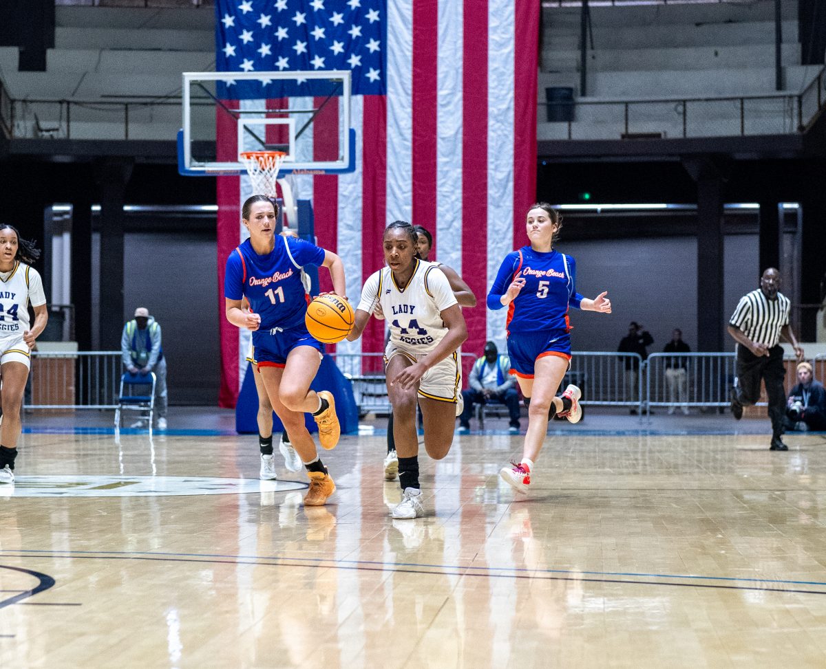 Jackson’s Jazmine Jones races upcourt against Orange Beach Monday in the Class 4A girls South Regional semifinals. Jones scored six of her 11 points in overtime to spark the Aggies’ 54-48 win. (Helen Joyce/Call News)