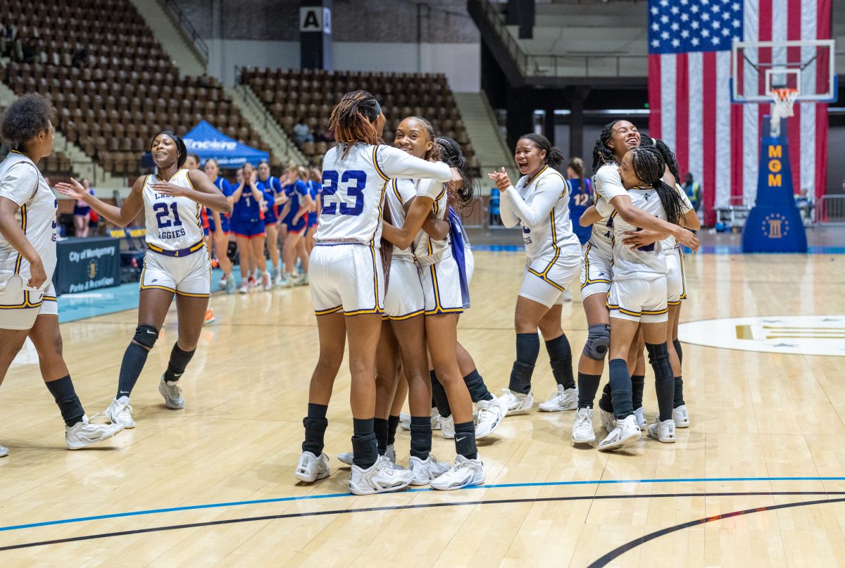 Jackson players celebrate their 54-48 overtime victory over Orange Beach Monday in the Class 4A girls South Regional semifinals at Garrett Coliseum in Montgomery. (Helen Joyce/Call News)
