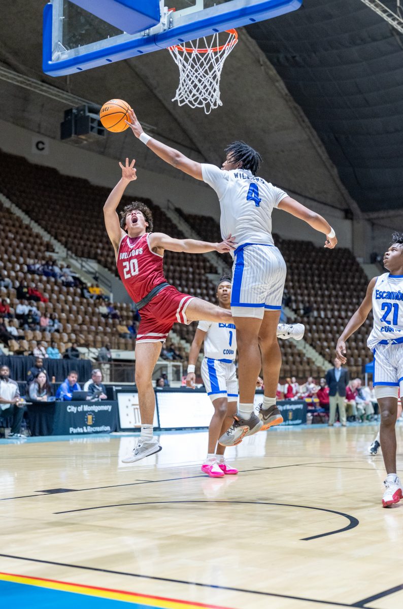 Escambia County’s Stephen Williams blocks a shot by UMS-Wright’s Jack Blackerby during Monday’s Class 4A South Regional semifinal at Garrett Coliseum in Montgomery. (Helen Joyce/Call News)