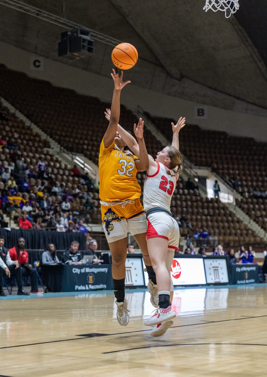 Jackson’s Angel Powell puts up a shot against T.R. Miller’s Meg Fountain Wednesday in the Class 4A girls South Regional final at Garrett Coliseum in Montgomery. Powell had 14 points and 13 rebounds in the Aggies’ 37-35 loss. (Helen Joyce/Call News)
