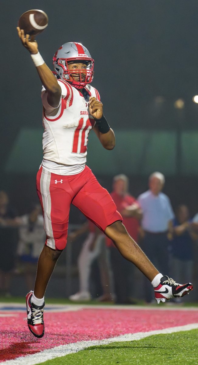 Saraland quarterback Jamison Roberts throws on the run during a playoff win over Pike Road last year. Roberts, who committed to Oklahoma Saturday, is rated the No. 1 quarterback in the state and No. 21 nationally. (Helen Joyce/Call News)